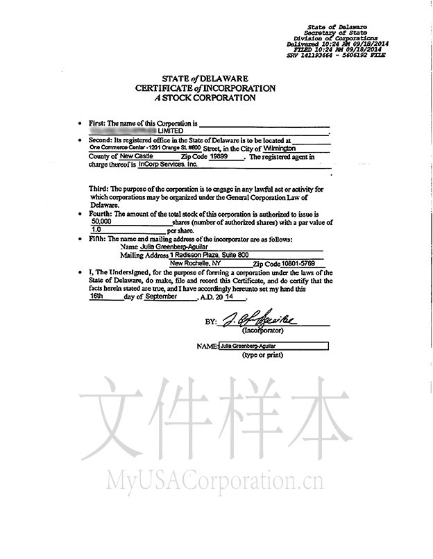 Delaware Corporation Certificate of Incorporation Sample