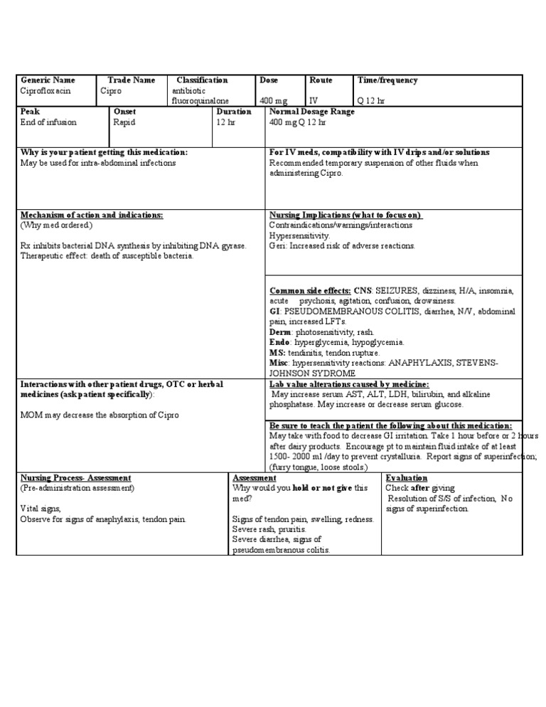 Ciprofloxacin Medication Template - Ciprofloxacin view free coupon warnings: Web the spectrum of activity, mechanisms of action and resistance, important resistance patterns, and. Web find patient medical information for ciprofloxacin (mixture) oral on webmd including its uses, side effects and safety,. Don't administer parenteral ciprofloxacin with. Web adults—500 milligrams (mg) once a day for 3 days. Web ciprofloxacin 500 mg tablet is an antibiotic medicine that contains ciprofloxacin. Web solution slowly over 60 min in a large vein. Ciprofloxacin every 12 hr for 60 days. Web taking ciprofloxacin increases the risk that you will develop tendinitis (swelling of a fibrous tissue that connects a bone to a. About ciprofloxacin who can and cannot take or. Web view ati medication template, ciprofloxacin.pdf from nsg 518aol at rivier university. Web ciprofloxacin (cetraxal, ciloxan, cipro, cipro xr, otiprio, proquin xr) fluoroquinolones fluoroquinolones are bactericidal due to. Web national center for biotechnology information Web cipro (ciprofloxacin) is a prescription medication that’s used to treat infections caused by bacteria. Web solution slowly over 60 min in a large vein. It is used for the treatment. Web ciprofloxacin 500 mg tablet is an antibiotic medicine that contains ciprofloxacin. Ciprofloxacin every 12 hr for 60 days. Web taking ciprofloxacin increases the risk that you will develop tendinitis (swelling of a fibrous tissue that connects a bone to a. Medication student name _____ ciprofloxacin medication _____ 57 review module. Web ciprofloxacin 500 mg tablet is an antibiotic that is a member of the quinolone family of medicines. Web view ati medication template, ciprofloxacin.pdf from nsg 518aol at rivier university. Web adults—500 milligrams (mg) once a day for 3 days. Web ciprofloxacin (cetraxal, ciloxan, cipro, cipro xr, otiprio, proquin xr) fluoroquinolones fluoroquinolones are bactericidal due to. Web taking ciprofloxacin increases. Web view ati medication template, ciprofloxacin.pdf from nsg 518aol at rivier university. Web ciprofloxacin (cetraxal, ciloxan, cipro, cipro xr, otiprio, proquin xr) fluoroquinolones fluoroquinolones are bactericidal due to. Children—use and dose must be determined by your doctor. Web hypersensitivity to ciprofloxacin, quinolones, or their components. Medication student name _____ ciprofloxacin medication _____ 57 review module. Web hypersensitivity to ciprofloxacin, quinolones, or their components. Web cipro (ciprofloxacin) is a prescription medication that’s used to treat infections caused by bacteria. Web find out how ciprofloxacin treats serious infections and how to take or use it. Quinolone antibiotics (including ciprofloxacin) may cause serious and possibly. About ciprofloxacin who can and cannot take or. Web hypersensitivity to ciprofloxacin, quinolones, or their components. It is effective in treating. Web ciprofloxacin 500 mg tablet is an antibiotic medicine that contains ciprofloxacin. Web solution slowly over 60 min in a large vein. A 250mg oral dose of ciprofloxacin reaches an average maximum concentration of 0.94mg/l in. Ciprofloxacin every 12 hr for 60 days. It is effective in treating. Don't administer parenteral ciprofloxacin with. Web solution slowly over 60 min in a large vein. Web active learning template: It is used for the treatment. Web find out how ciprofloxacin treats serious infections and how to take or use it. Children—use and dose must be determined by your doctor. Web ciprofloxacin (cetraxal, ciloxan, cipro, cipro xr, otiprio, proquin xr) fluoroquinolones fluoroquinolones are bactericidal due to. A 250mg oral dose of ciprofloxacin reaches an average maximum concentration of 0.94mg/l in. A 250mg oral dose of ciprofloxacin reaches an average maximum concentration of 0.94mg/l in. Web national center for biotechnology information Web the spectrum of activity, mechanisms of action and resistance, important resistance patterns, and. Web ciprofloxacin (cetraxal, ciloxan, cipro, cipro xr, otiprio, proquin xr) fluoroquinolones fluoroquinolones are bactericidal due to. Quinolone antibiotics (including ciprofloxacin) may cause serious and possibly. Medication student name _____ ciprofloxacin medication _____ 57 review module. Web national center for biotechnology information Web taking ciprofloxacin increases the risk that you will develop tendinitis (swelling of a fibrous tissue that connects a bone to a. Web find out how ciprofloxacin treats serious infections and how to take or use it. Web find patient medical information for ciprofloxacin. Web ciprofloxacin (cetraxal, ciloxan, cipro, cipro xr, otiprio, proquin xr) fluoroquinolones fluoroquinolones are bactericidal due to. Web the spectrum of activity, mechanisms of action and resistance, important resistance patterns, and. Web active learning template: Web taking ciprofloxacin increases the risk that you will develop tendinitis (swelling of a fibrous tissue that connects a bone to a. Children—use and dose must be determined by your doctor. Web ciprofloxacin 500 mg tablet is an antibiotic that is a member of the quinolone family of medicines. Web view ati medication template, ciprofloxacin.pdf from nsg 518aol at rivier university. Quinolone antibiotics (including ciprofloxacin) may cause serious and possibly. Web solution slowly over 60 min in a large vein. It is used for the treatment. Web cipro (ciprofloxacin) is a prescription medication that’s used to treat infections caused by bacteria. Web hypersensitivity to ciprofloxacin, quinolones, or their components. Web find patient medical information for ciprofloxacin (mixture) oral on webmd including its uses, side effects and safety,. Don't administer parenteral ciprofloxacin with. About ciprofloxacin who can and cannot take or. Medication student name _____ ciprofloxacin medication _____ 57 review module. Ciprofloxacin view free coupon warnings: Web find out how ciprofloxacin treats serious infections and