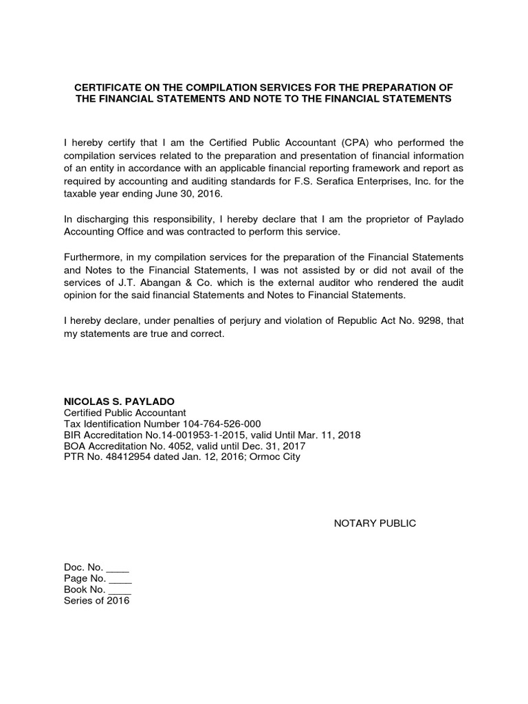 CPA Compilation Report Certified Public Accountant Financial Statement