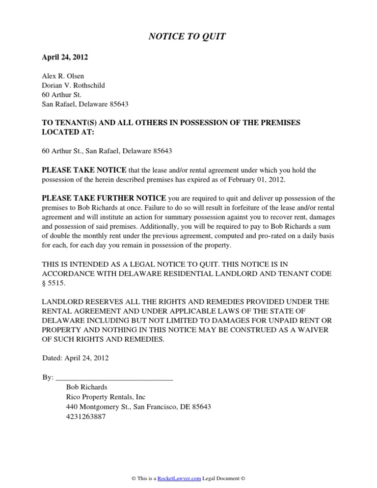 Free Delaware Eviction Notice Template Rocket Lawyer