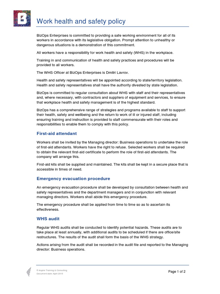 BSBWHS401 WHS policy.pdf First Aid Occupational Safety And Health
