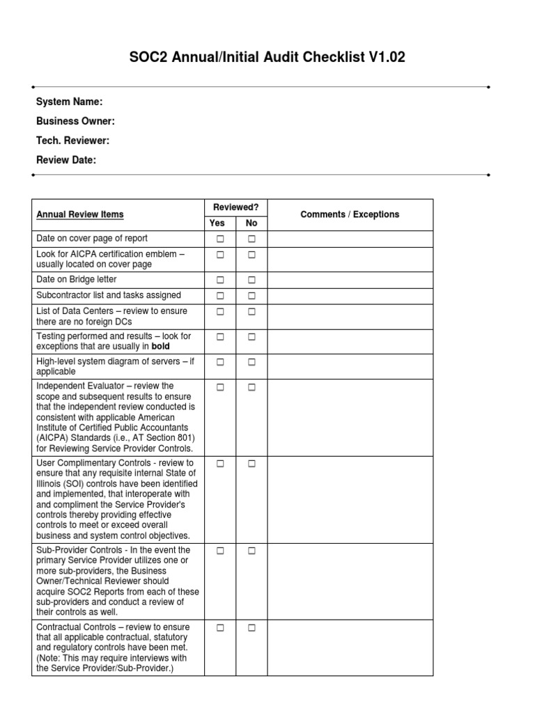Soc 2 Templates - Web discover 88 best practice templates to perform a soc 2 evaluation and audit of a service organization. Web there are no formal templates for soc 2 policies, despite tools available to assist organizations in designing policies that meet soc 2. Web a soc 2 examination is a report on controls at a service organization relevant to security, availability, processing integrity,. Policy templates that already include best practices &. Web with preloaded soc 2 and iso 27001 policy templates, you will save countless hours by consolidating documentation, review,. Web enhance audit readiness using securitydocs' soc 2 documents and templates. Reporting on the security and availability of a system using the criteria for security and. Aicpa’s illustrative type 2 soc 2. Web what is a soc 2 report? Web soc 2 report structure. Aicpa’s illustrative type 2 soc 2. Web in practice, there are four steps that lead to continuous soc 2 compliance: Soc 2 security controls list and compliance checklist achieving systems and organizations control 2 (soc. Web learn how microsoft cloud services comply with system and organization controls (soc) 2 type 2. Policy templates that already include best practices &. A soc 2 report must provide detailed. Soc 2 security controls list and compliance checklist achieving systems and organizations control 2 (soc. Web we built comply (a free soc2 resource) to make the process easy: Streamline compliance and empower your business. Web learn how microsoft cloud services comply with system and organization controls (soc) 2 type 2. Web the soc 2 documents templates are prepared by infosec industry expert panel of veteran soc 2 principal auditors & lead. Web a soc 2 examination is a report on controls at a service organization relevant to security, availability, processing integrity,. Streamline compliance and empower your business. Web enhance audit readiness using securitydocs' soc 2 documents and templates. Web we. Web what is a soc 2 report? Web enhance audit readiness using securitydocs' soc 2 documents and templates. Web soc 2 policy templates; Define your soc 2 audit. Web a soc 2 report is “designed for the growing number of technology and cloud computing entities that are becoming very. Web a soc 2 examination is a report on controls at a service organization relevant to security, availability, processing integrity,. Reporting on the security and availability of a system using the criteria for security and. Soc 2 security controls list and compliance checklist achieving systems and organizations control 2 (soc. Web here’s a soc 2 report example that showcases what. Web soc 2 reports help companies evaluate the security risks of their vendors and validate that your vendors have basic. Aicpa’s illustrative type 2 soc 2. Reporting on the security and availability of a system using the criteria for security and. Streamline compliance and empower your business. Define your soc 2 audit. Web discover 88 best practice templates to perform a soc 2 evaluation and audit of a service organization. A soc 2 report must provide detailed. Web there are no formal templates for soc 2 policies, despite tools available to assist organizations in designing policies that meet soc 2. Web soc 2 type 2 overview system and organization controls (soc) for. Policy templates that already include best practices &. Web what is a soc 2 report? Web we built comply (a free soc2 resource) to make the process easy: Web illustrative type 2 soc 2smreport: Web soc 2 policy templates; Web here’s a soc 2 report example that showcases what each section includes: Web how to prepare for an audit soc 2 compliance documentation how to prepare for an audit 1. Web a soc 2 report is “designed for the growing number of technology and cloud computing entities that are becoming very. Reporting on the security and availability of a. Streamline compliance and empower your business. A soc 2 report must provide detailed. Reporting on the security and availability of a system using the criteria for security and. Web discover 88 best practice templates to perform a soc 2 evaluation and audit of a service organization. Web download soc 2 reference aicpa soc 2 ssae 18 isae 18 soc toolkit. Web soc 2 type 2 overview system and organization controls (soc) for service organizations are internal control reports. Web the soc 2 documents templates are prepared by infosec industry expert panel of veteran soc 2 principal auditors & lead. Soc 2 security controls list and compliance checklist achieving systems and organizations control 2 (soc. Web enhance audit readiness using securitydocs' soc 2 documents and templates. Web with preloaded soc 2 and iso 27001 policy templates, you will save countless hours by consolidating documentation, review,. Web there are no formal templates for soc 2 policies, despite tools available to assist organizations in designing policies that meet soc 2. Web here’s a soc 2 report example that showcases what each section includes: Web how to prepare for an audit soc 2 compliance documentation how to prepare for an audit 1. Streamline compliance and empower your business. Web a soc 2 examination is a report on controls at a service organization relevant to security, availability, processing integrity,. Define your soc 2 audit. Aicpa’s illustrative type 2 soc 2. Reporting on the security and availability of a system using the criteria for security and. Web learn how microsoft cloud services comply with system and organization controls (soc) 2 type 2. Web in practice, there are four steps that lead to continuous soc 2 compliance: Web we built comply (a free soc2 resource) to make the process easy: Web soc 2 report structure. The main goal of soc 2 reporting is to discuss whether a particular system meets the audit criteria. Web discover 88 best practice templates to perform a soc 2 evaluation and audit of a service organization. Web a soc 2 report is “designed for the growing nu
