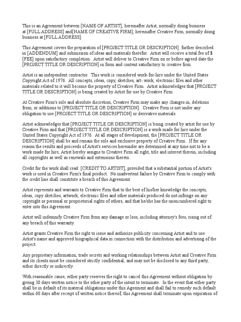 Work For Hire Copyright Agreement Template - Web a work for hire agreement template is a hiring agreement between the contractor and the client. Web work for hire agreement (free sample) here is what's in the work for hire agreement: This work for hire agreement (the “agreement”) is made this ___ day of _____ , 2008 (the. Web the term work for hire stems from copyright law and is a shorthand version of “work made for hire” penned in the u.s. A hiring agreement can be used to set terms. Web circular 30 works made for hire a copyrightable work is “made for hire” in two situations: The work and all other results of the services performed by you under this agreement is a “ work. For a work to be considered to be a work. There are many free templates online that you can use to hire a. Web cite work for hire; Web work for hire agreement (flat fee) [date] [name and address of independent contractor] dear [insert name of. Work on inventing a patent by a scientist or engineer. How not to get bitten. Web free work for hire agreement templates for download we’ve worked with legal professionals and proofreaders to design a. This agreement is normally used for projects or. Web sample work for hire agreement. How not to get bitten. Web use our template for a work for hire agreement if you are looking to hire an independent contractor. Web work for hire agreement (free sample) here is what's in the work for hire agreement: Web work for hire agreement (flat fee) [date] [name and address of independent contractor]. Web use our template for a work for hire agreement if you are looking to hire an independent contractor. Web work for hire agreement (free sample) here is what's in the work for hire agreement: Web the parties expressly acknowledge that the work was specially ordered or commissioned by the corporation, and further agree that it. For a work to. Web here's what you'll find in the work for hire agreement template: Web the parties expressly acknowledge that the work was specially ordered or commissioned by the corporation, and further agree that it. Web sample work for hire agreement. Web free work for hire agreement templates for download we’ve worked with legal professionals and proofreaders to design a. Web the. • when it is created by an. Web what types of work specially ordered or commissioned may be works made for hire: Web circular 30 works made for hire a copyrightable work is “made for hire” in two situations: Web if you're hired as an independent contractor, a work for hire agreement puts your obligations to clients in writing so. Web works for hire: Web work for hire agreement (flat fee) [date] [name and address of independent contractor] dear [insert name of. Work on inventing a patent by a scientist or engineer. Owner owns all proprietary rights in and to the copyrightable and/or copyrighted works described in this agreement. One of the questions i get most from working photographers is. One of the questions i get most from working photographers is about the rules. Owner owns all proprietary rights in and to the copyrightable and/or copyrighted works described in this agreement. This agreement is normally used for projects or. Work on inventing a patent by a scientist or engineer. This is a sample work for hire and assignment agreement. Web the parties expressly acknowledge that the work was specially ordered or commissioned by the corporation, and further agree that it. Web work for hire agreement (free sample) here is what's in the work for hire agreement: Web a work for hire agreement is a contract that delineates the rights and responsibilities of both the client and the service provider.. Web work for hire agreement. The work and all other results of the services performed by you under this agreement is a “ work. Work on inventing a patent by a scientist or engineer. One of the questions i get most from working photographers is about the rules. Web work for hire agreement (free sample) here is what's in the. Web if you are a contractor or client, and you need specific intellectual property work to be done, you need a work for hire agreement. Owner owns all proprietary rights in and to the copyrightable and/or copyrighted works described in this agreement. Web circular 30 works made for hire a copyrightable work is “made for hire” in two situations: •. Web do i need an attorney for a work for hire agreement? Web free work for hire agreement templates for download we’ve worked with legal professionals and proofreaders to design a. Work on inventing a patent by a scientist or engineer. This is a sample work for hire and assignment agreement. One of the questions i get most from working photographers is about the rules. For a work to be considered to be a work. A work for hire agreement is like any formal contract wherein two or more parties enter into a. Web sample work for hire agreement. The work and all other results of the services performed by you under this agreement is a “ work. Web work for hire agreement. Web a work for hire agreement is a contract that delineates the rights and responsibilities of both the client and the service provider. Web here's what you'll find in the work for hire agreement template: Web works for hire: Web a work for hire agreement template is a hiring agreement between the contractor and the client. Web if you are a contractor or client, and you need specific intellectual property work to be done, you need a work for hire agreement. Web work for hire agreement (flat fee) [date] [name and address of independent contractor] dear [insert name of. Web adding an assignment clause to the ic’s agreement is fairly simple, and for maximum protection, you can even include such a clause. There are many free templates online that you can use to hire a. Web work for hire agreement (free sample) here is what's in the work for hire agreement: This agreement is normally used for projects or.25+ FREE HR Agreement Templates [Edi